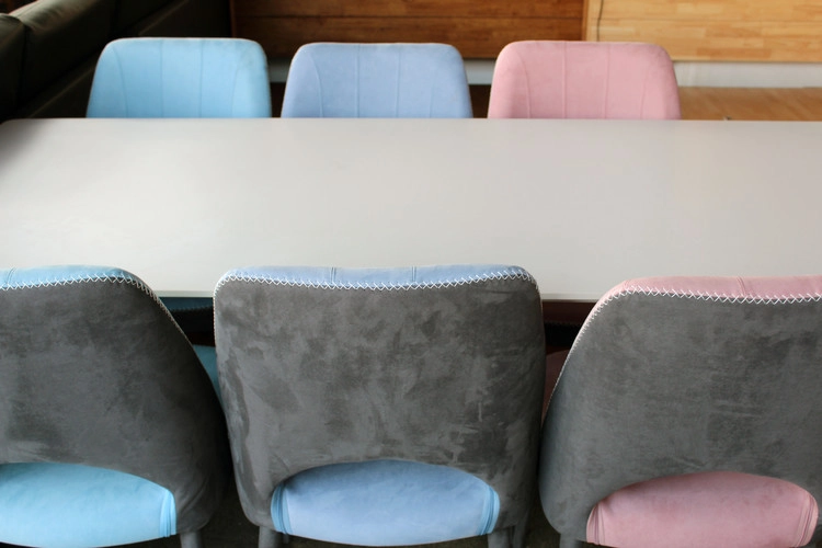 화이트 테이블과 파스텔 의자로